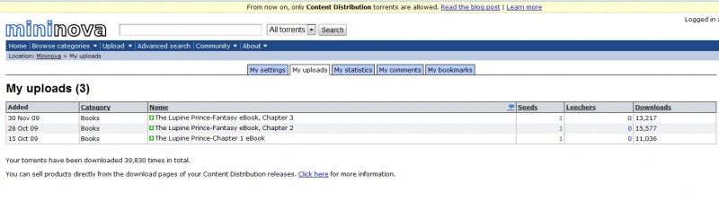 … isn’t something I’m going to fix properly. It’s a screenie… so I’ll write what’s most important about it: “Your torrents have been downloaded 39,830 times in total.” That’s impressive, but what does it mean? Assuming that, since there are three chapters, 1 person made three downloads, then at most, 10,000 people read the first three chapters of my book. And what does that translate to, into sales? Zero, but that’s not important. What is important, is that probably 10k people read it, and it’s possible many, many more downloaded at least one chapter. Why is that important if it’s still zero conversion into actual sales of the physical book? Because what if I was giving away my entire book for free? Several artists and authors do that with different works. I’ll be doing that with other works as well, probably.